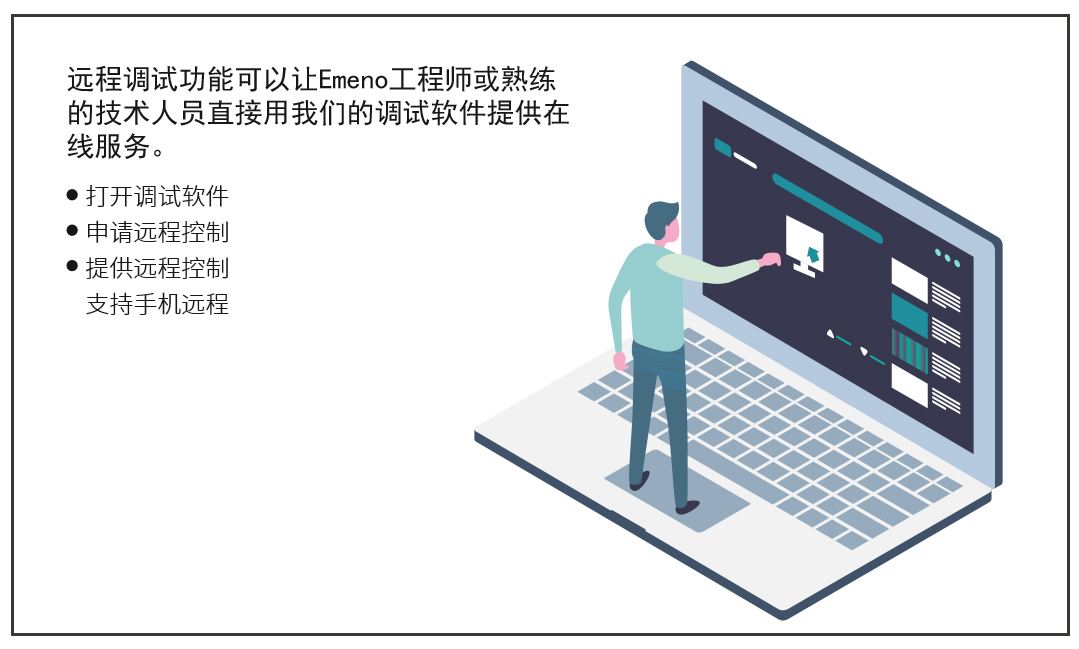 立方美所有产品都支持远程调试售后服务,如发生误报,客户可以选择手机APP或电脑调试;如设备发生故障,客户可通过手机APP程序控制设备连接到服务器,公司有专人对在线故障设备远程进行故障的排查和解决。无忧的售后服务让客户更省心省力。