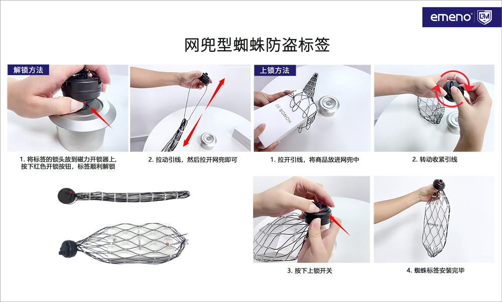 1. 拉开引线,将商品放进网兜中; 2. 转动收紧引线; 3. 按下上锁开关,蜘蛛标签安装完毕;