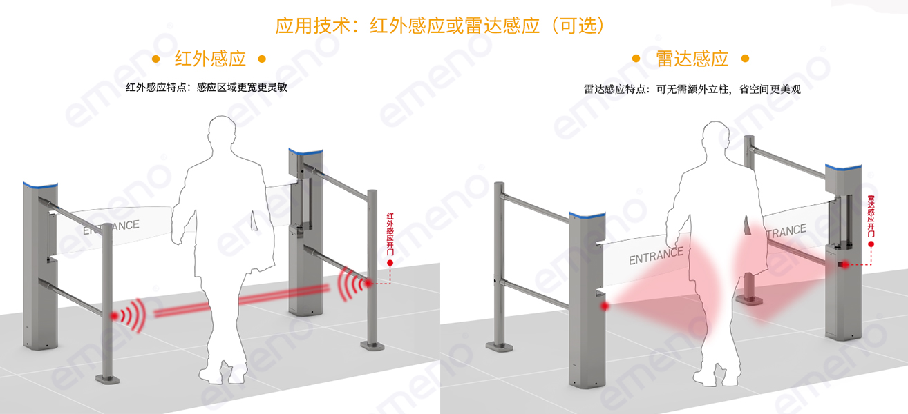 ST100系列超市运用了红外感应及雷达感应技术。2柱摆闸运用雷达感应,4柱的可选用红外或雷达技术,6柱的使用红外感应。红外感应具有感应区域更宽更灵敏的特点,而雷达感应则可无需额外的立柱,省时间更美观。客户可根据自身需求选用不同数量立柱!