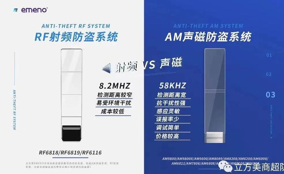 考虑到各类客户的需求,这两种系统立方美均有研发。如果你的商店门距较窄,店内商品种类不是很多,客流量也相对少的话,可以选择安装射频防盗系统。而大型商场、超市、服装品牌店一般建议安装声磁防盗系统,因为大超市要防盗的商品品种比较多,门距宽,需要检测率更强大的声磁防盗系统来防盗。