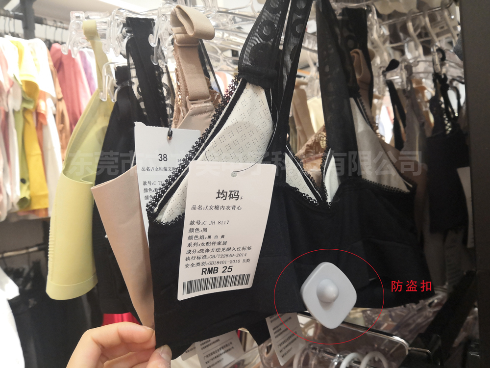 与商超防盗器配合使用的是防盗标签,内衣店一般用的是防盗扣,只要将防盗扣钉在内衣上即可,防盗扣相当于防盗感应信号。如果防盗扣没有在收银台处解开,那么经过商超防盗器时便会触发防盗系统报警。