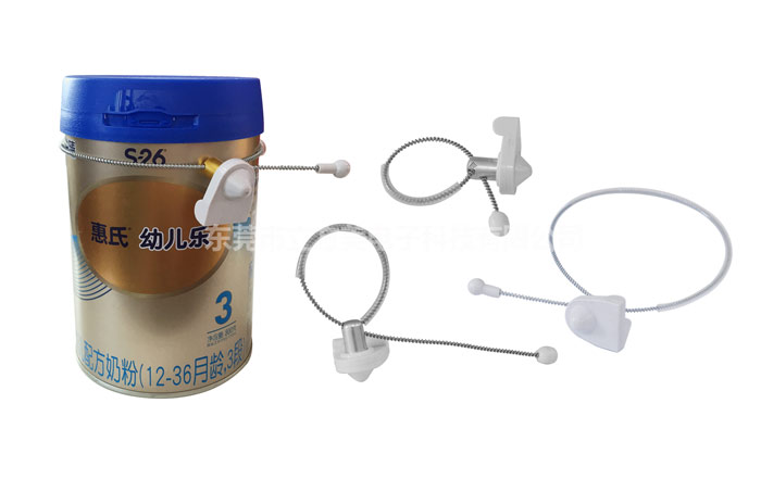 像红酒、奶粉、油这类型产品无法像衣服那样直接用平钉扣上,所以需要用到瓶扣型硬标签,这种硬标签直接将产品直接拴住,绳长可以调节,可以运用到不同的罐状,瓶状商品。