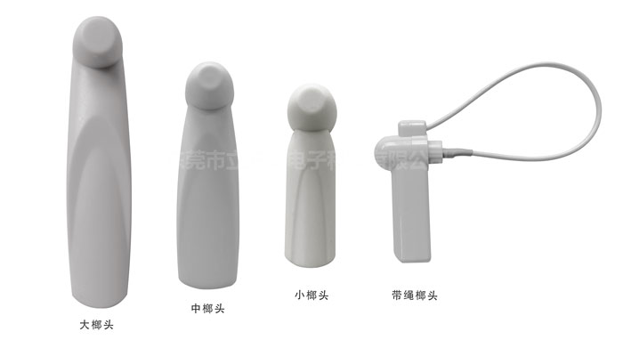 防盗硬标签最常用的是榔头扣,根据大小可分为小榔头、中榔头、大榔头。榔头长度和磁棒越大,检测距离就越远。一般46mm长25磁棒的小榔头感应距离约为1.8米,51mm33磁棒中榔头感应距离约为2米,61mm长39磁棒大榔头感应距离约为2.4米。店铺可以根据实际的EAS商超防盗设备安装情况选用不同的榔头扣。